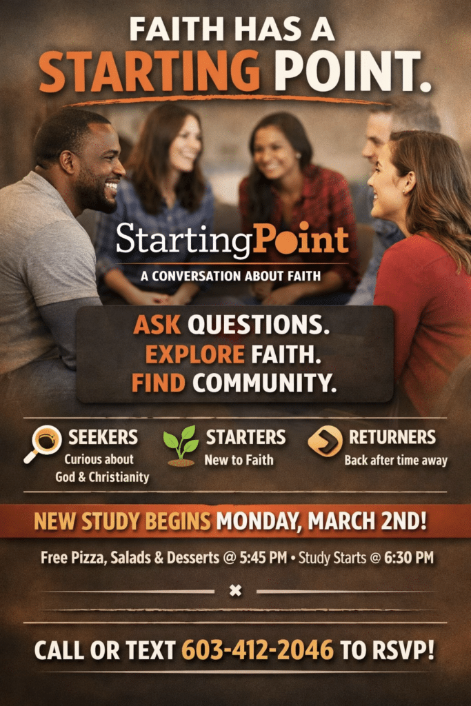 Begins Monday, March 2nd at 6:30 PM at the church. Free pizza, salad, and desserts! Childcare is provided.